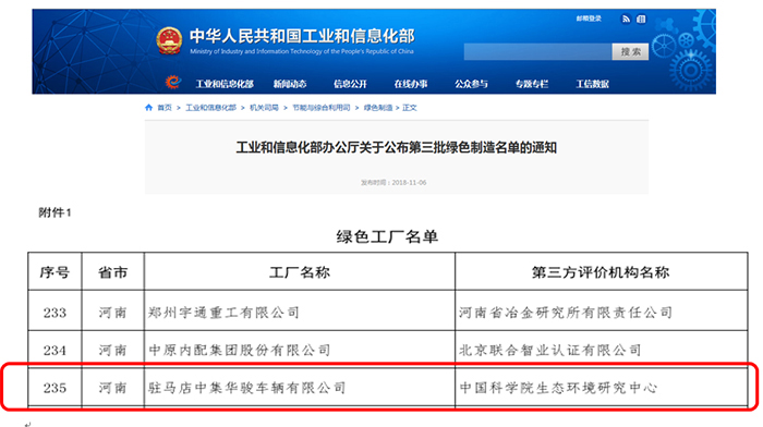 2018年11月6日,工業(yè)和信息化部公布了第三批綠色制造示范名單,駐馬店中集華駿車(chē)輛有限公司被評(píng)定為國(guó)家級(jí)“綠色工廠”,成為國(guó)內(nèi)掛車(chē)行業(yè)第一家綠色工廠。這也是中集華駿車(chē)輛2018年度第三次獲得“國(guó)字號(hào)”榮譽(yù)。