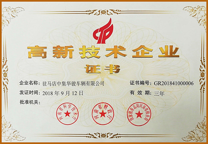 12月21日,駐馬店中集華駿車輛有限公司榮膺高新技術(shù)企業(yè)。這是公司繼2005年、2009年、2012年、2015年獲評高新技術(shù)企業(yè)后,連續(xù)5期獲得高新技術(shù)企業(yè)認定。此證書由河南省科學(xué)技術(shù)廳、河南省財政廳、國家稅務(wù)總局河南省稅務(wù)局聯(lián)合頒發(fā)。