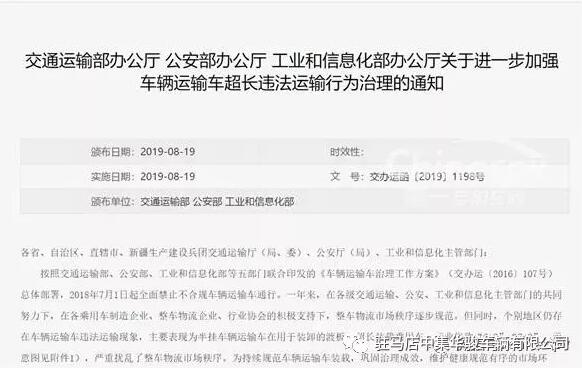 2019年8月20日,交通運(yùn)輸部辦公廳、公安部辦公廳、工業(yè)和信息化部辦公廳發(fā)布《關(guān)于進(jìn)一步加強(qiáng)車輛運(yùn)輸車超長(zhǎng)違法運(yùn)輸行為治理的通知》(以下簡(jiǎn)稱《通知》)。